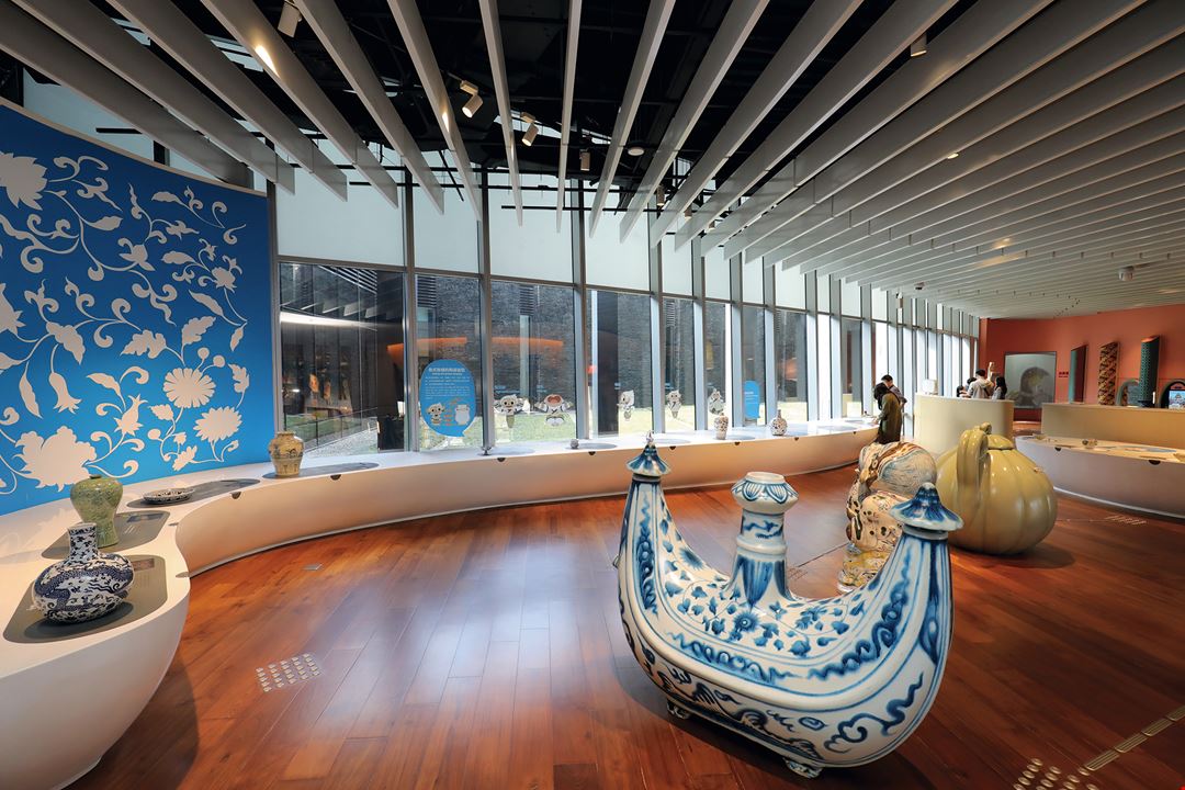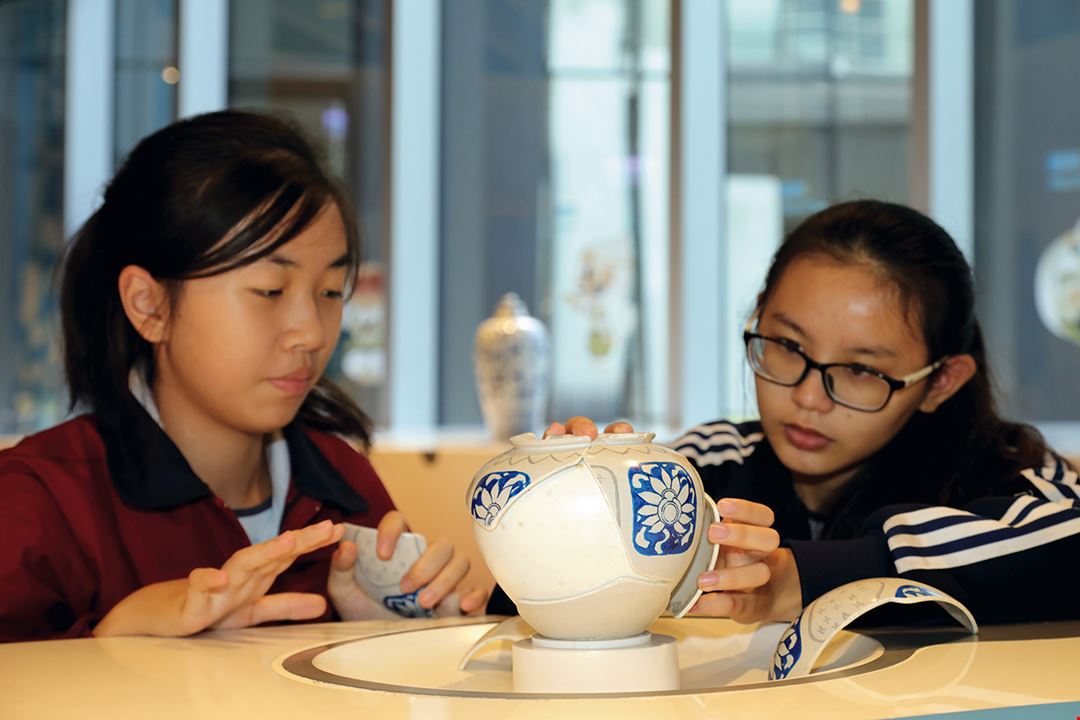 The Children's Creative Center is different from most museums. Here one seldom sees the words "do not touch." Children can use their five senses to experience works from the National Palace Museum. The exhibition features an array of ceramic treasures from the NPM collection, including examples of blue-and-white china with floral patterns from Emperor Yongle's reign (1402‡1424) in the Ming Dynasty and a Korean maebyeong vessel with an inlaid cloud and crane pattern, from the Goryeo Dynasty (918‡1392). Visitors can play house with copies of antique blue-and-white china that exude a highly cultured and artistic air.