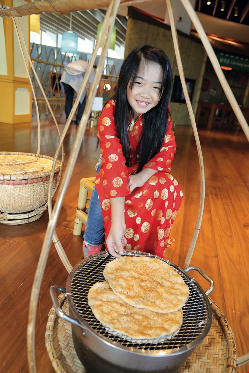 Another exhibition area focuses on Vietnamese food, clothing, residences, and culture. Like in the area on Indonesian textiles, here too visitors can put on traditional Vietnamese clothing to try out for themselves. Wearing an ao dai dress, you can stroll along a traditional Vietnamese street featuring a zongzi shop, a pastry shop, a drum store, and a street stall proprietor kneading dough.